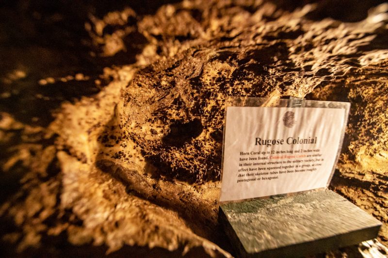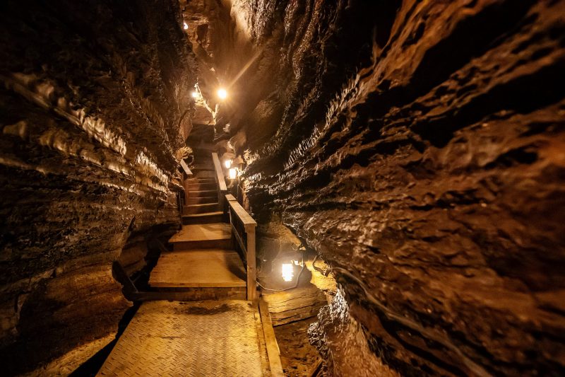 On the hottest summer days, the Caves are cool. For your comfort, take a light sweater. There is a set of stairs leading you into the Caves and one that takes you out of the Caves. A beautiful trail that passes a sink hole will bring you back. Low-heeled shoes are required.